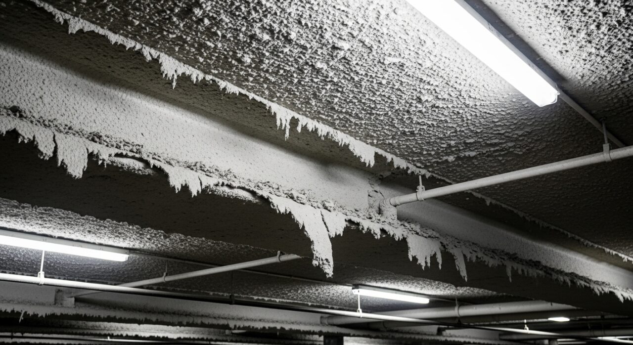 私たちが以前、ある大規模な商業ビルの改修工事で直面した事例をご紹介します。事前調査で天井裏に広範囲のレベル1の吹付け石綿が検出されました。
